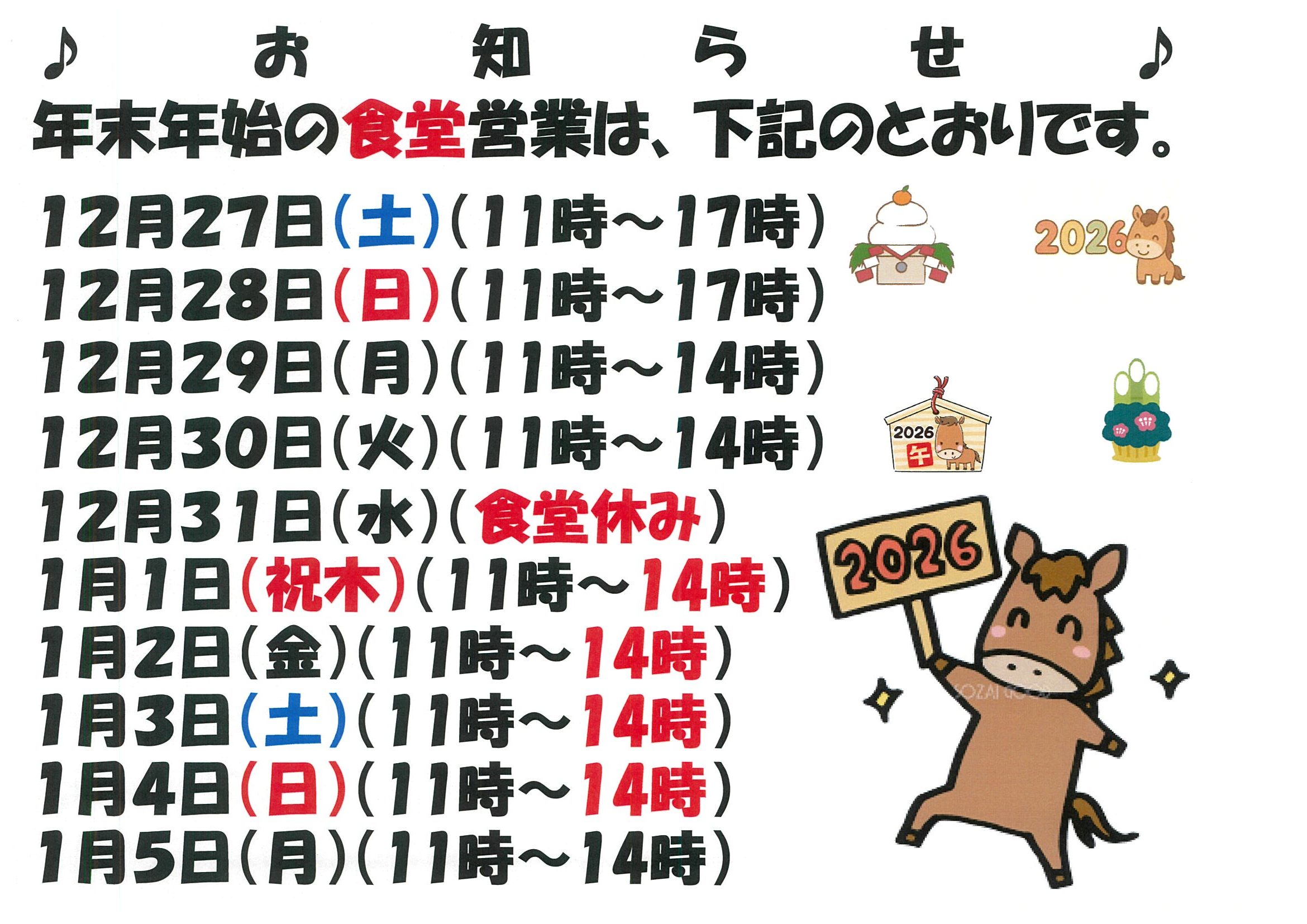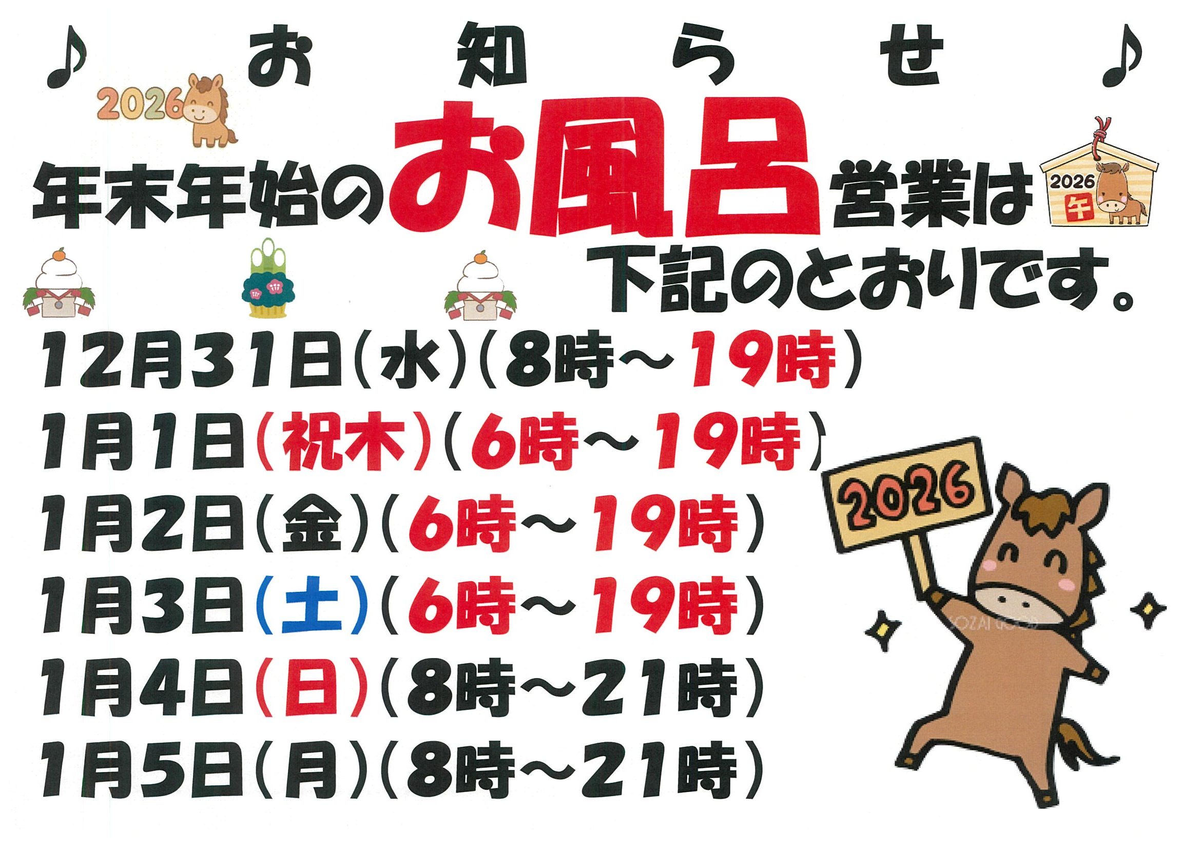 2025年11月22日 / 最終更新日時 : 2025年11月22日 sakamotoayoro お知らせ 年末年始の、営業時間をお知らせします🤠 今年は元旦から3日までの、お風呂の、営業時間を6時~19時までとさせて頂きます。その他は、例年通りです🤠 たくさんのお客様のお越しを従業員一同、お待ちしております🤠