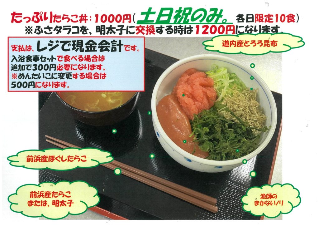 2025年11月15日 / 最終更新日時 : 2025年11月15日 sakamotoayoro お知らせ 新メニューのお・し・ら・せ・🐟 メニューに、たっぷりたらこ丼を、ラインナップします🤡 今日から、土日祝のみたっぷりたらこ丼を、提供する事にしました。数量限定、各日とも10食😁 いつもの、ほぐしタラコに、ふさタラコを乗っけました🤠まわりを囲むのは、北海道産とろろ昆布、あーんど・・・。瀬戸内海産、漁師のまかない海苔🐟 お値段はたっぷりたらこ丼が、1000円ちょっっきり💰ふさタラコを明太子に変更すると1200円💰 たくさんのお客様のご来店を、おまちしております。